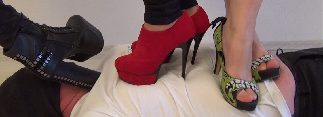 Hi there! Kelly and Lucy are trampling their slave together again! They are wearing socks; like this they are destroying him! They are jumping, standing on his throat and face, standing on tiptoes, while the slave is suffering as hell... So for fans (too) it's a must-see video! ;)
